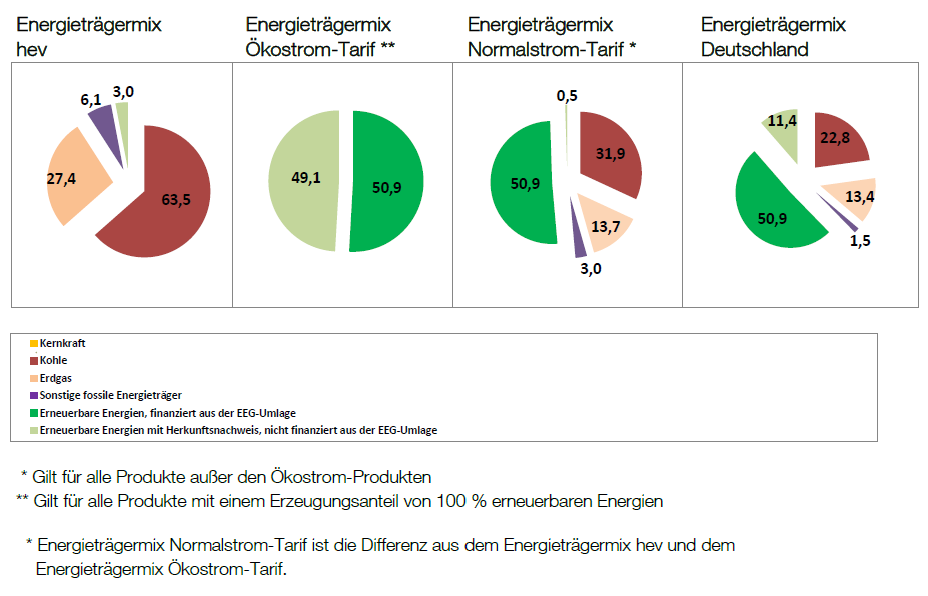 Sie müssen klar erkennen können, aus welchen Energieträgern sich unser Strom zusammensetzt – und welchen Anteil sie an unserem Strom-Mix haben. Der Strom-Mix der HEV besteht aus den drei Kategorien: Kernenergie, erneuerbare Energieträger sowie fossile und sonstige Energieträger.
